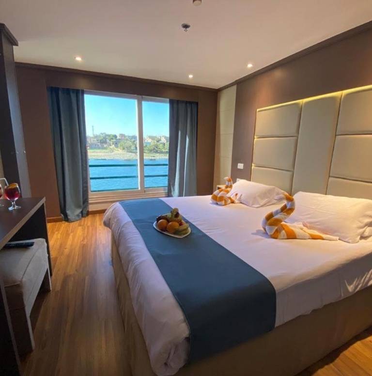 Les bateaux de croisière sur le Nil offrent un hébergement 5 étoiles avec divers types de cabines. Certains navires comme le MS Mayfair proposent des chambres de luxe avec balcons privés tandis que d'autres comme le Princess Sarah I offrent des cabines standard et suites donnant sur le Nil. Les équipements standard incluent climatisation, salles de bains privées et grandes fenêtres. Un voyageur TourRadar a commenté : « La croisière était mieux que prévu. La nourriture était de grande variété et de bonne qualité, l'hébergement assez spacieux et l'équipage était très amical et serviable. »