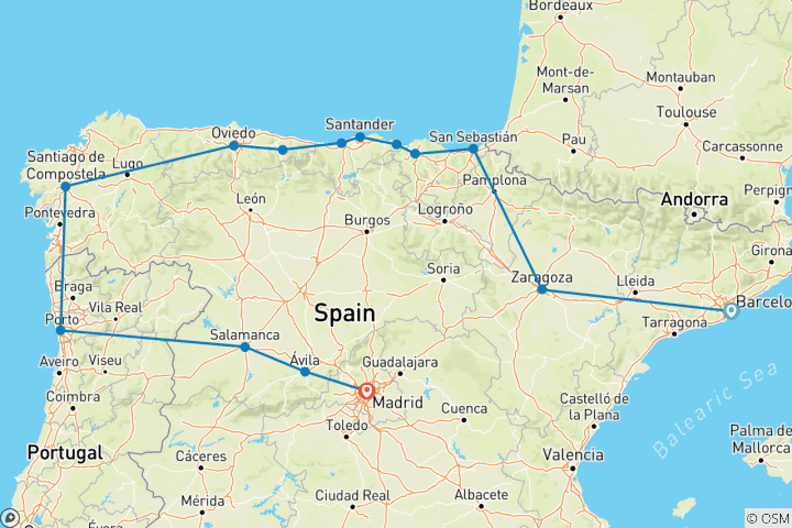 - Barcelone, Saragosse, Pampelune, Saint-Sébastien, Bilbao,Santander,Santillana del Mar,Covadonga,Oviedo,Salamanque,Madrid+6 de plus